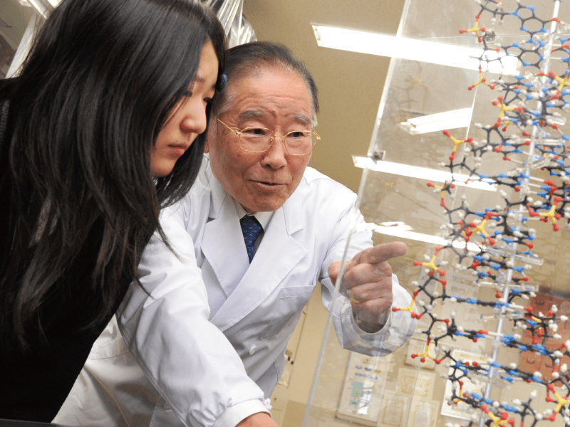 大阪城のふもと、追手門学院で育った私は、中学1年生のときに、遥か遠い英国の研究者が、生物共通の設計図であるDNA の構造を明らかにしたというニュースを聞きました。彼らが組み立てたのは、たった4 種類の分子(塩基)からなる美しい螺旋を描いた分子模型でした。この発見から広がる未来を想像したときの、胸の高鳴りを今でも覚えています。そこから「生命現象を化学で語りたい、解明したい」という夢につながり、大学では医学部から工学部に転部して、抗生物質の研究を始めました。一貫して取り組んできたのが、入手できる最も単純な化合物から出発し,複雑な構造を有する天然物そのものを化学的に合成する「全合成」と呼ばれる研究でした。これは、構造と活性を明らかにするだけでなく、従来の化学が正しかったことを立証でき、さらに新しい反応や方法論を見つけることにもつながるのです。一晩寝ずに80工程ある合成方法を、詰め将棋のように一気に考えることもありました。より美しくよりシンプルな方法を求めて、時間を忘れて熱中したものです。
