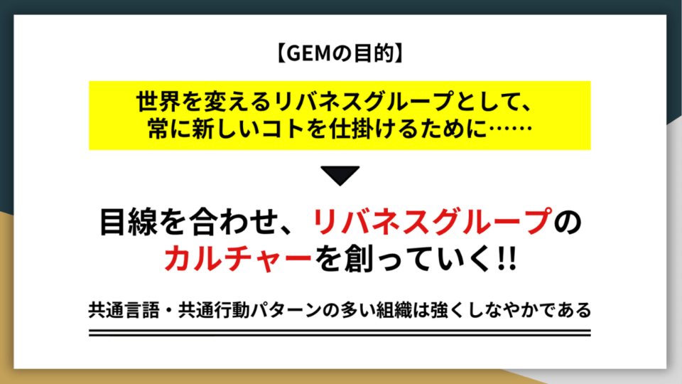 そのリバネスグループ各社の代表が定期的に集い、「共通言語・共通行動パターンの多い組織は強くしなやかである」という仮説のもとで、リバネスグループとしてのカルチャーを創ることを目的に実施しているのがGEM(Group Executive Meeting)です。
