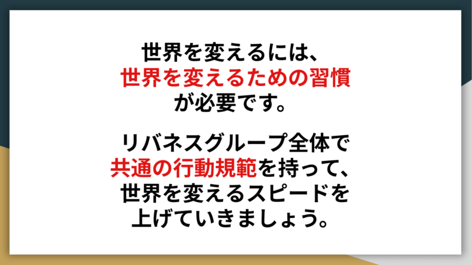 そのため、リバネスではルール制定を最小限のものに留める一方で、行動基準としてのノームを組織全体に浸透させることによって、一体感と自律性を両立した「強くしなやかなチーム」の形成を実現しています。