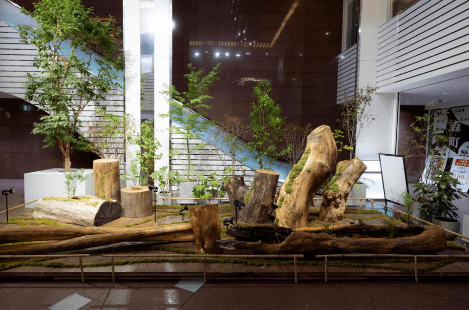 「木庭 MOKUTEI」に利用する木材は、雷で割れたり、2本の木がくっついたりとさまざまな個性を持つ一方で、一般的な木材としては価値が付きにくい木材を採用しています。また、苗木や植栽は木材の原産地である東京都西多摩郡檜原村の生態系を再現したものとなっています。苗木や苔はビルのワーカーや来館者など通行する人々が水を吹きかけることで成長していき、1~2年後には成長した苗木を檜原村の自然環境に植樹することで都市と自然環境の間の循環による森の再生を実現します。また、都市で生活する人々に「都市に居ながら森の再生や生物多様性の保全に貢献する」という新しい自然とのつながりの感覚を提供することで、人々や社会のウェルビーイング向上を図ります。