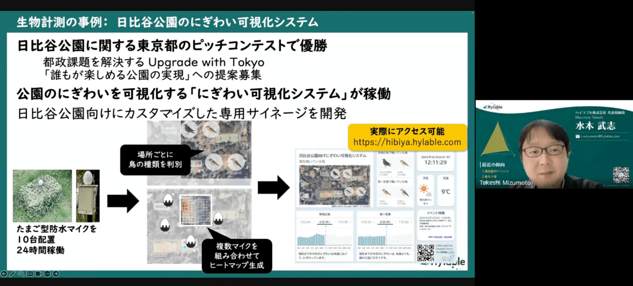 その後、ハイラブル株式会社、水本氏より、鳥類など“音を出す生物”の多様性を可視化するモニタリング技術「KoeTurri(コエチュリー)」を解説。また、本技術の活用事例について紹介がありました。