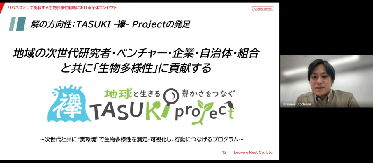 最後にリバネスの小玉からは、30by30実現後の世界に必要となる維持の仕組みと人材育成方法の案として、地域の企業・大学・行政・ベンチャーが連携し、人材育成と最先端技術による生物多様性評価に挑む「TASUKI -襷- Project」の紹介を行いました。