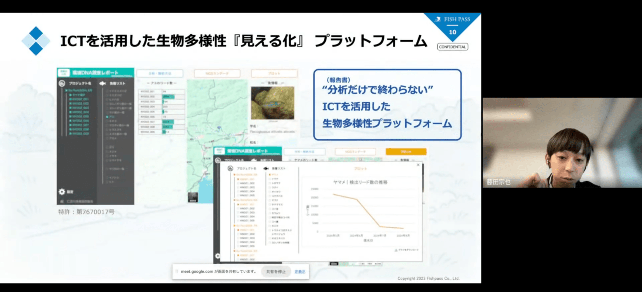 次に株式会社フィッシュパス、藤田氏からは、水中DNA解析により生物相を把握する環境DNA技術の社会実装事例を紹介。河川の生息分布の可視化、絶滅危惧種調査、OECM評価、教育活用の取り組みに加え、資源管理や地理データと統合した分布予測マップ、一般に分かりやすい可視化プラットフォームの開発構想が示されました。