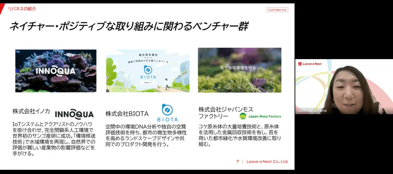 セミナーでは冒頭リバネスの中嶋より、当社の生物多様性領域での取り組みと、評価・技術開発を推進するベンチャーについて、事例について紹介しました。