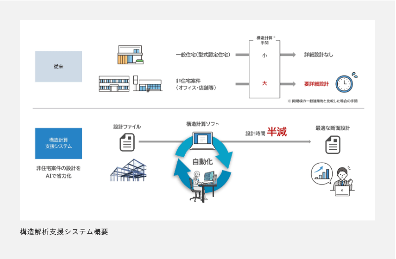 トヨタホーム株式会社は、主力である鉄骨ユニット工法による戸建住宅の新築請負事業に加えて、「非住宅分野でのユニット工法事業の拡大」を推進しており、社員寮・店舗・医療介護施設、神社仏閣など多様なニーズへの対応を強化しています。一方で、詳細な構造計算が不要な通常の戸建住宅とは異なり、非住宅案件では、都度詳細な構造計算が必要となるため、技術者の負担が大きく、対応の遅れが受注機会の損失につながるという課題がありました。