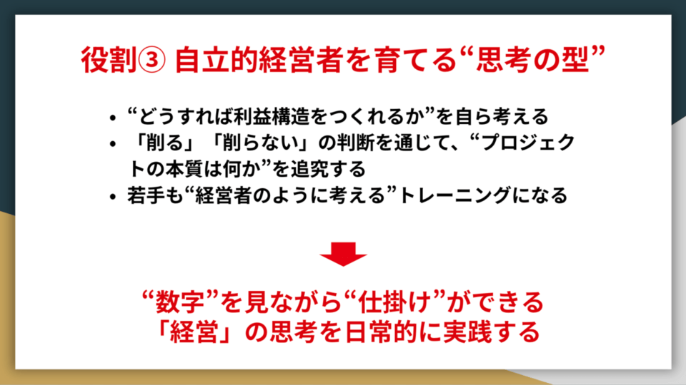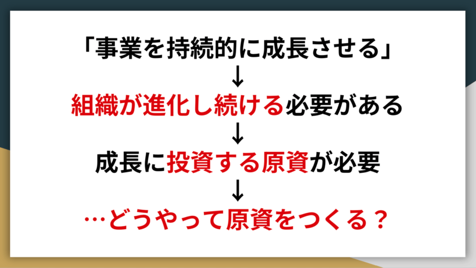 ごく一部の例外を除き、基本的にはこのルールを徹底することで、「未来への仕掛け」の原資が自動的に蓄積されます。つまり成長への投資をプロジェクトの設計段階から組み込んでおくことで、事業の持続的な成長が実現するという構造です。