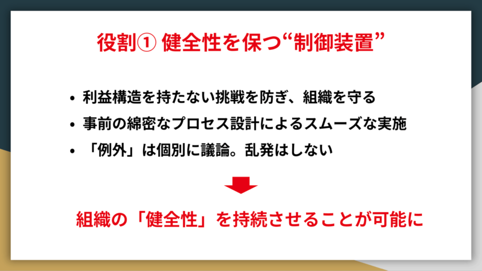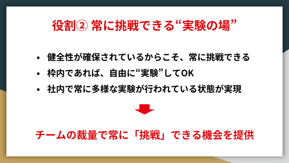 リバネスでは経営的な観点から、本ルールに3つの役割を設定しています。「健全性を保つ“制御装置”」「常に挑戦できる“実験の場”」「自立的経営者を育てる“思考の型”」という3つの位置付けを組み込むことによって、単なる利益確保のためのルールではなく、組織全体の多面的な成長を促す仕組みとして機能させています。