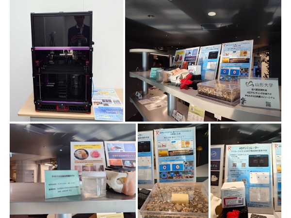 4Dプリンタの実機(写真左上)を展示しているほか、4Dプリントの実例として外科手術用の組織モデル、植物の種子の播種デバイス、4Dプリンティング用のシミュレーター解説などを展示しています。