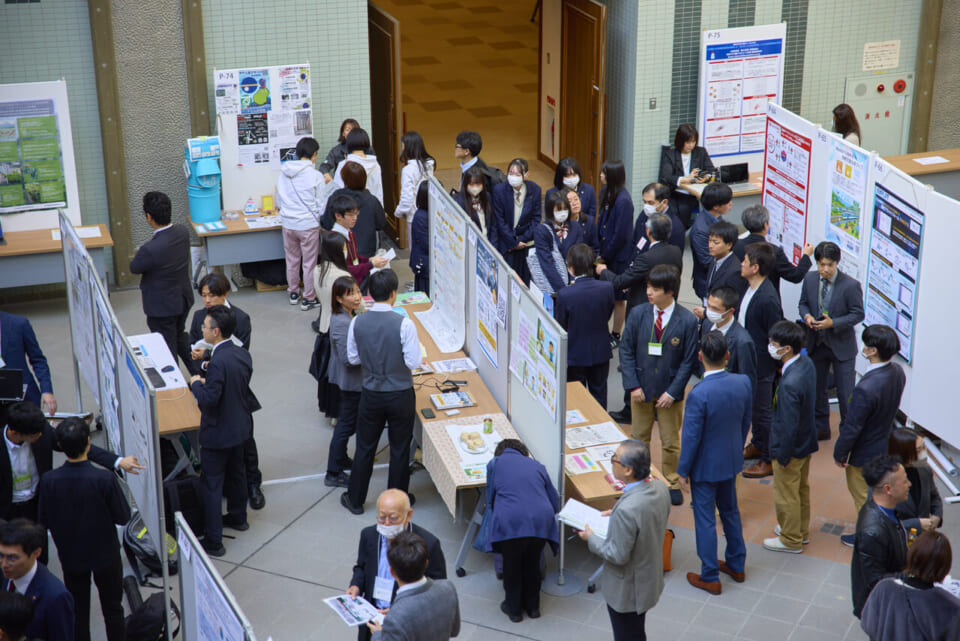 ポスター・ブースには過去最多となる77件の演題が集まりました。豊橋技術科学大学の研究者や地元企業だけでなく、市内外から小学生、高校生、研究者、ベンチャー企業、中小・中堅企業など分野・業種の垣根を超えて様々な方の発表が行われました。