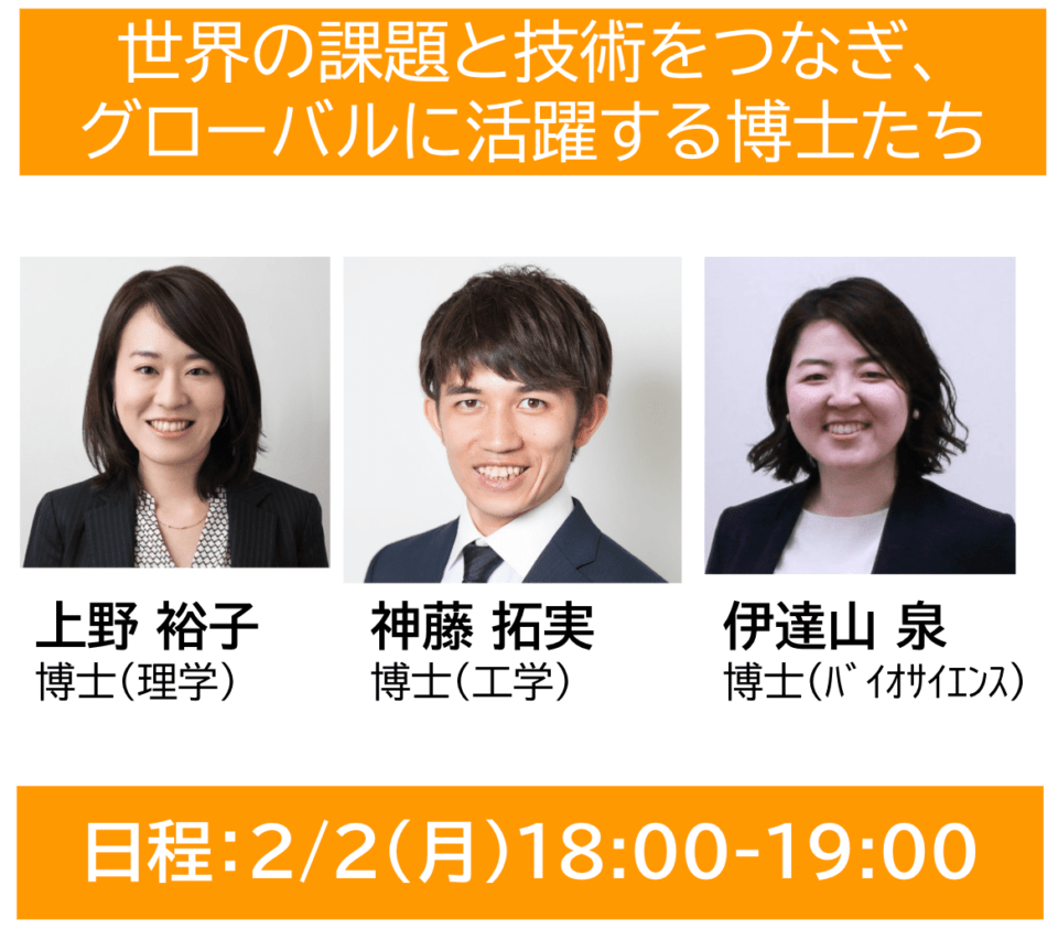 本座談会は、博士課程学生が自身のキャリアを考える上で、企業というフィールドにおける博士の多様な働き方を知る機会を提供することを目的としています。