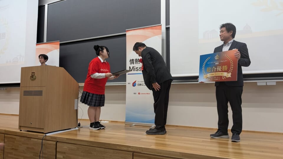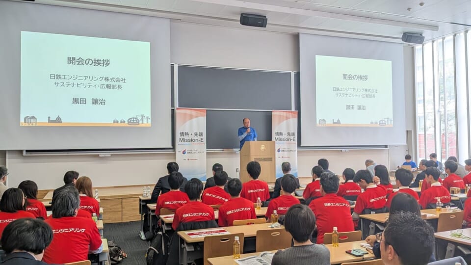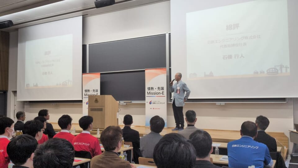 コンテスト終了後には、過去にMission-Eに参加した卒業生によるポスター発表や、指導にあたった日鉄エンジニアリングのエンジニア、参加校同士の交流会も開催され、世代や立場を越えた学びとつながりが生まれました。最後に、日鉄エンジニアリングの石倭行人社長より、各校に修了証が授与されました。