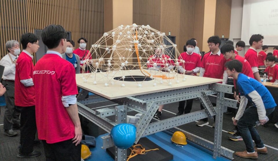 最終コンテストは、日本大学(駿河台)キャンパスを会場として開催され、同大学建築学科の学生の皆さまにも運営・準備にご協力いただきました。各校が開発した構造物については、プレゼンテーションと実証試験の両面から審査を実施しました。