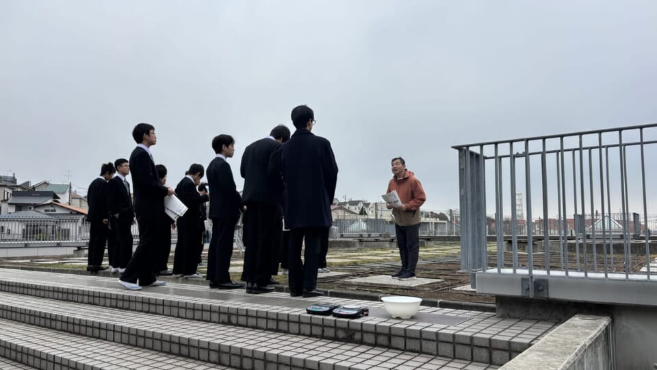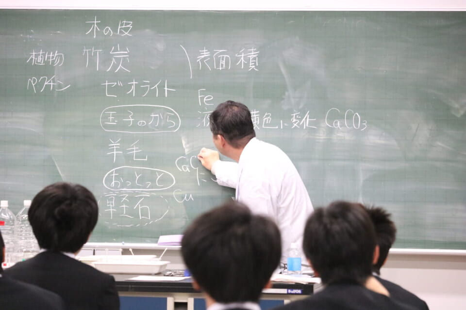 午後は班ごとに仮説を立て、自分たちで集めた身近なもので銅や鉄の金属イオンを吸着できるかという実験を行いました。生徒たちは、屋上庭園や化学実験室で様々な吸着材を収集し、午前中に習得したパックテストを用いて鉄・銅の吸着の程度を評価しました。その結果を班ごとに発表し、その内容を踏まえて、金属の吸着材に求められる特性や実際の現場で求められる特性について講師から解説を行いました。一日の実験を通じて、身の回りにはまだまだ知らない力をもったものが潜んでいることを感じてもらいました。