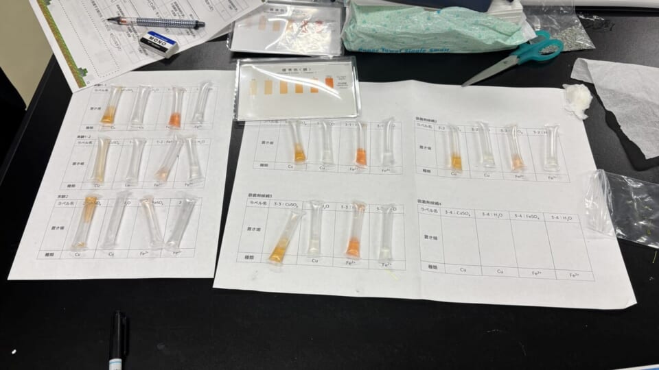 午前は、苔が水中に溶けている金属を採ることができる性質に着目して実験を行いました。乾燥ミズゴケが水溶液中の鉄・銅の金属イオンを吸着する様子を、パックテストの色変化として可視化しました。さらに、希塩酸を用いてミズゴケが吸着した金属を抽出する実験を行い、乾燥ミズゴケがイオン交換によって金属を吸着していることを確認しました。