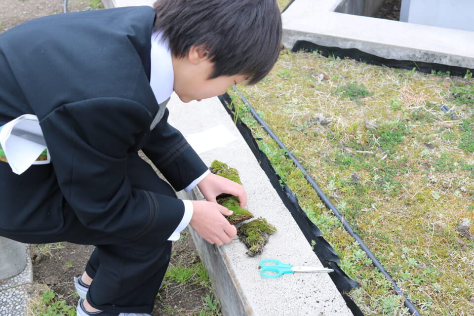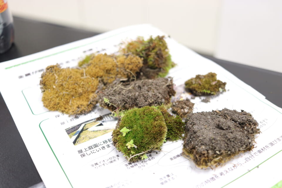 | 苔が金属を吸着したのかをパックテストで確認 | 午後は屋上庭園で吸着剤候補を探索 |