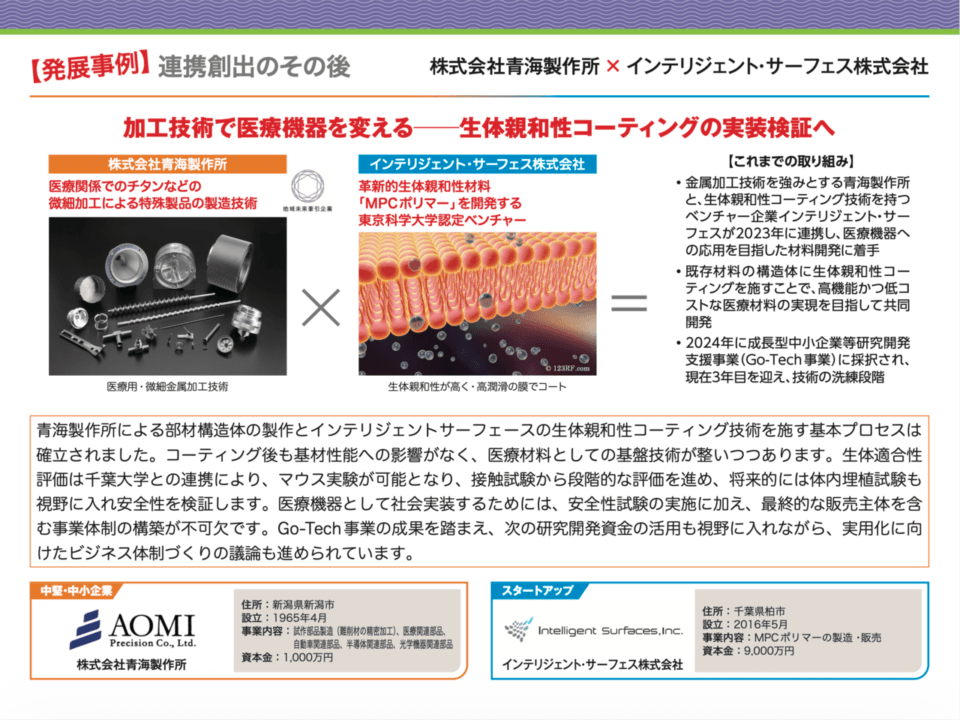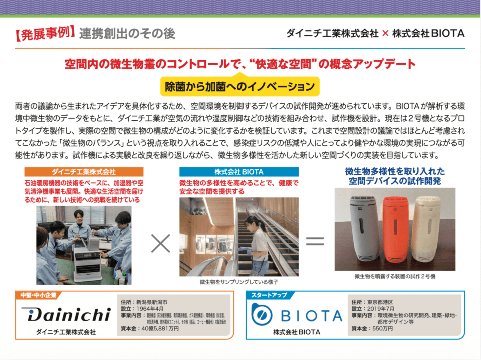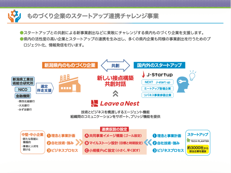 2025年度は、新潟県・新潟県工業技術総合研究所・にいがた産業創造機構・金融機関と共に、スタートアップとの連携の実現性が高い新規事業創出意欲のある経営者へヒアリングを行いました。そこから連携可能性のあるスタートアップとの連携の検討や、実際に中堅・中小企業とスタートアップの連携プロジェクトを創出しました。その連携事例の中から4件の連携成果と、3件の過年度連携事例の発展をPDFマガジンで紹介しています。