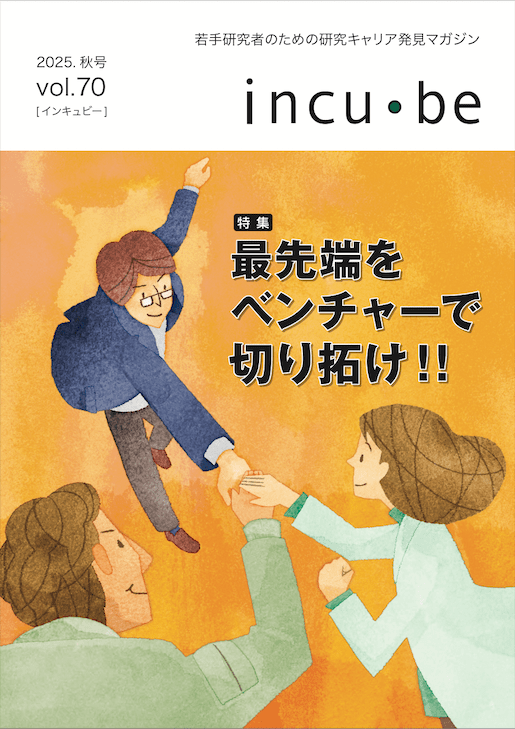 incu・be 「若手研究者のための研究キャリア発見マガジン」として発行している冊子です。研究者の皆さん、そして研究者を志す皆さんに、自分らしい研究キャリアを発見していただけるよう、さまざまなコンテンツをお届けします。 vol.70(2025年秋号) ダウンロード vol.69(2025年夏号) ダウンロード vol.68(2025年春号) ダウンロード vol.67(2024年冬号) ダウンロード vol.66(2024年秋号) ダウンロード vol.65(2024年夏号) ダウンロード vol.64(2024年春号) ダウンロード vol.63(2023年冬号) ダウンロード vol.62(2023年秋号) ダウンロード vol.61(2023年夏号) ダウンロード vol.60(2023年春号) ダウンロード vol.59(2022年冬号) ダウンロード vol.58(2022年秋号) ダウンロード vol.57(2022年夏号) ダウンロード vol.56(2022年春号) ダウンロード vol.55(2021年冬号) ダウンロード vol.54(2021年秋号) ダウンロード vol.53(2021年夏号) ダウンロード vol.52(2021年春号) ダウンロード vol.51(2020年冬号) ダウンロード vol.50(2020年秋号) ダウンロード vol.49(2020年夏号) ダウンロード vol.48(2020年春号) ダウンロード vol.47(2019年冬号) ダウンロード vol.46(2019年秋号) ダウンロード vol.45(2019年夏号) ダウンロード vol.44(2019年春号) ダウンロード vol.43(2018年冬号) ダウンロード vol.42(2018年秋号) ダウンロード vol.41(2018年夏号) ダウンロード vol.40(2018年春号) ダウンロード vol.39(2017年冬号) ダウンロード vol.38(2017年秋号) ダウンロード vol.37(2017年夏号) ダウンロード vol.36(2017年春号) ダウンロード vol.35(2016年冬号) ダウンロード vol.34(2016年秋号) ダウンロード vol.33(2016年春号) ダウンロード vol.32(2015年冬号) ダウンロード