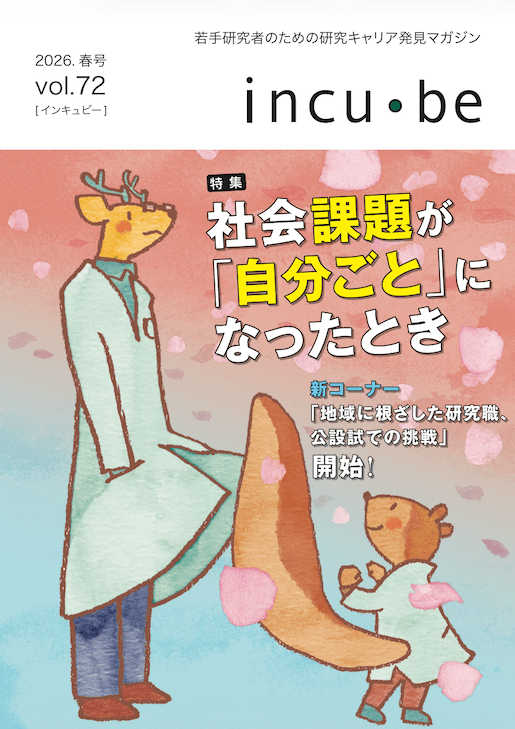 incu・be 「若手研究者のための研究キャリア発見マガジン」として発行している冊子です。研究者の皆さん、そして研究者を志す皆さんに、自分らしい研究キャリアを発見していただけるよう、さまざまなコンテンツをお届けします。 vol.72(2026年春号) ダウンロード vol.71(2025年冬号) ダウンロード vol.70(2025年秋号) ダウンロード vol.69(2025年夏号) ダウンロード vol.68(2025年春号) ダウンロード vol.67(2024年冬号) ダウンロード vol.66(2024年秋号) ダウンロード vol.65(2024年夏号) ダウンロード vol.64(2024年春号) ダウンロード vol.63(2023年冬号) ダウンロード vol.62(2023年秋号) ダウンロード vol.61(2023年夏号) ダウンロード vol.60(2023年春号) ダウンロード vol.59(2022年冬号) ダウンロード vol.58(2022年秋号) ダウンロード vol.57(2022年夏号) ダウンロード vol.56(2022年春号) ダウンロード vol.55(2021年冬号) ダウンロード vol.54(2021年秋号) ダウンロード vol.53(2021年夏号) ダウンロード vol.52(2021年春号) ダウンロード vol.51(2020年冬号) ダウンロード vol.50(2020年秋号) ダウンロード vol.49(2020年夏号) ダウンロード vol.48(2020年春号) ダウンロード vol.47(2019年冬号) ダウンロード vol.46(2019年秋号) ダウンロード vol.45(2019年夏号) ダウンロード vol.44(2019年春号) ダウンロード vol.43(2018年冬号) ダウンロード vol.42(2018年秋号) ダウンロード vol.41(2018年夏号) ダウンロード vol.40(2018年春号) ダウンロード vol.39(2017年冬号) ダウンロード vol.38(2017年秋号) ダウンロード vol.37(2017年夏号) ダウンロード vol.36(2017年春号) ダウンロード vol.35(2016年冬号) ダウンロード vol.34(2016年秋号) ダウンロード vol.33(2016年春号) ダウンロード vol.32(2015年冬号) ダウンロード