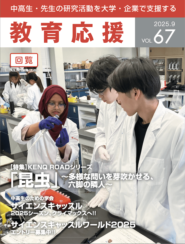教育応援プロジェクトにご登録いただいた教育関係者全員に無料で送付している季刊冊子<教育応援>。学校現場と大学、学校現場と企業など、様々な組織の連携による先進的な科学教育の取り組みを多く紹介しています。中高生向けの研究費募集や学会の大会情報も掲載していますので、探究活動や部活動での研究指導にもお役立てください。